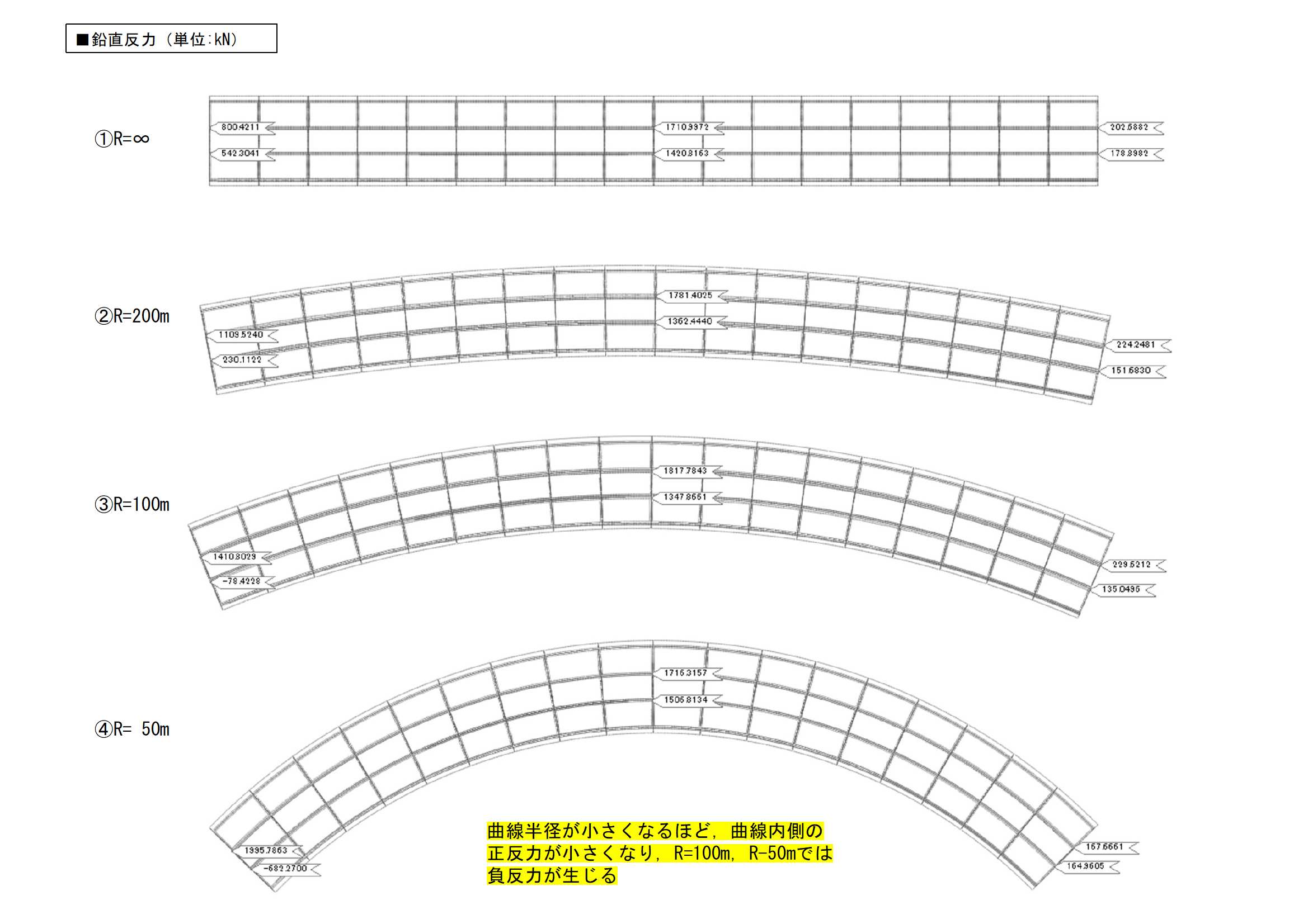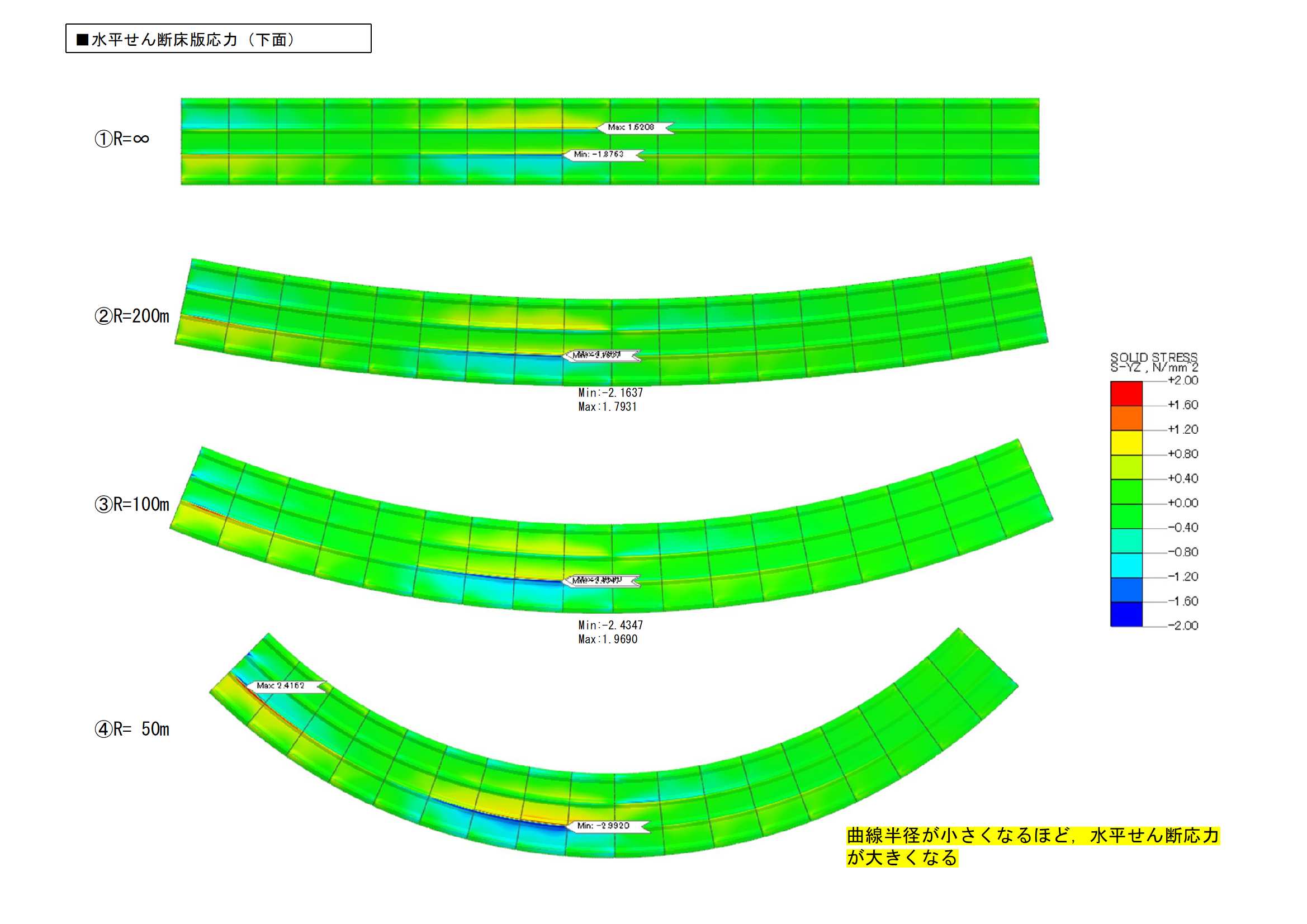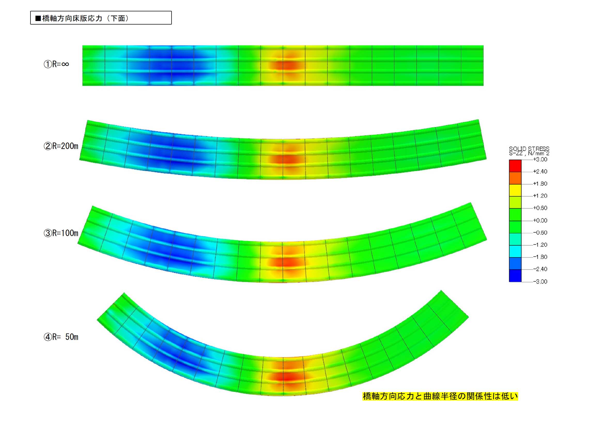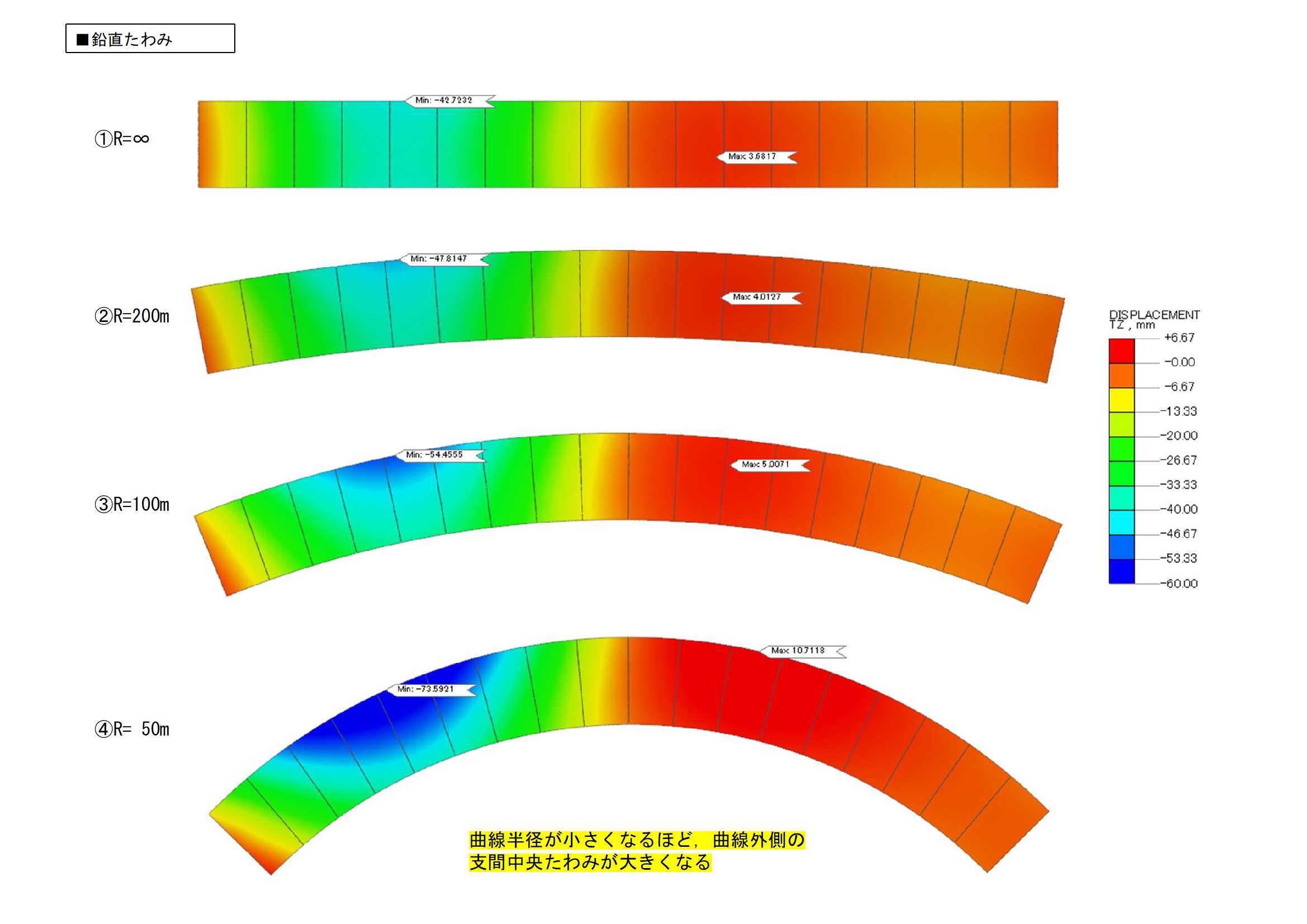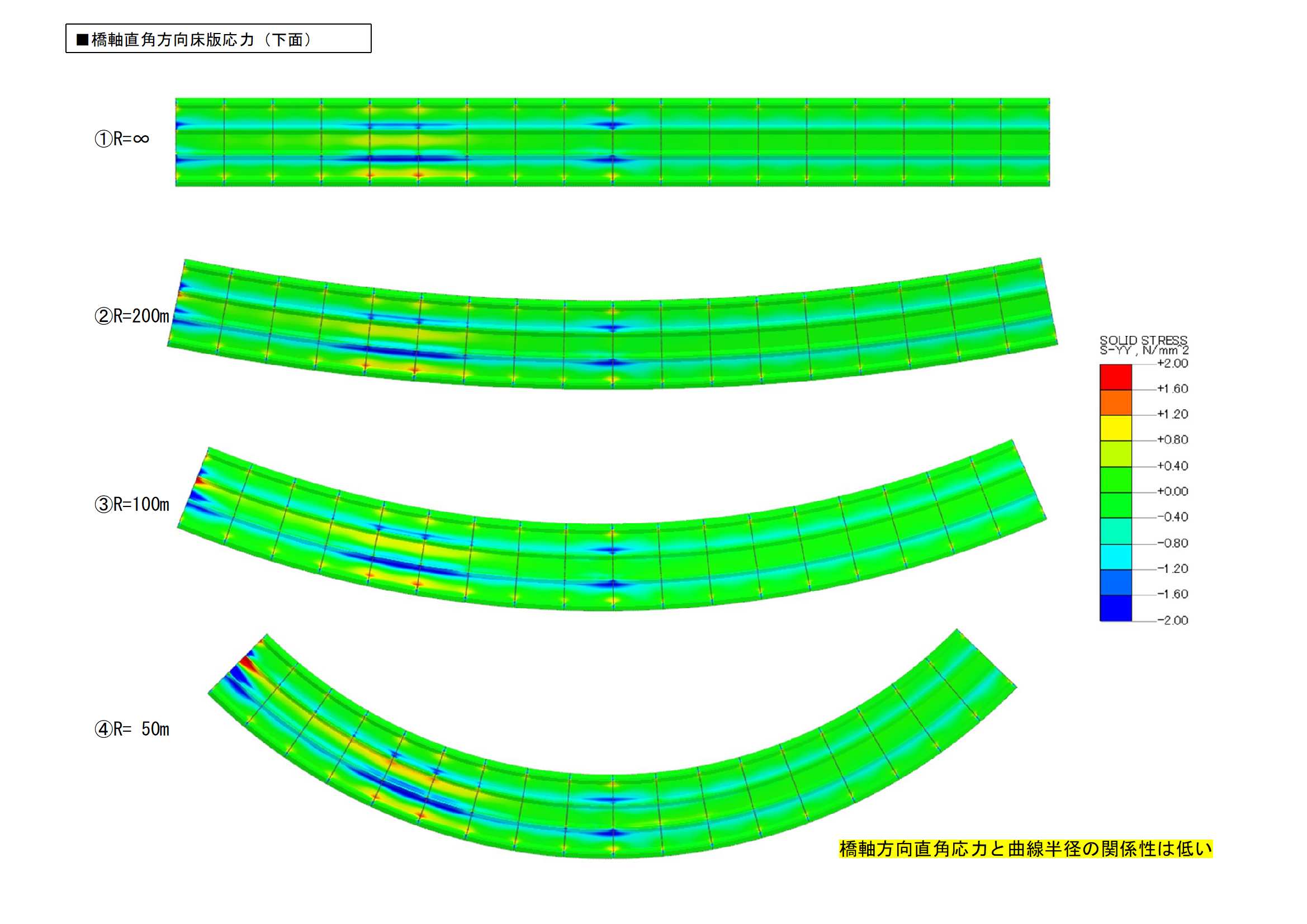 RC床版を有する2径間連続の単一箱桁モデルに対し,直線,R=200m,R=100m,ならびにR=50mの4ケースの解析を実施し,得られた知見を以下に示します。