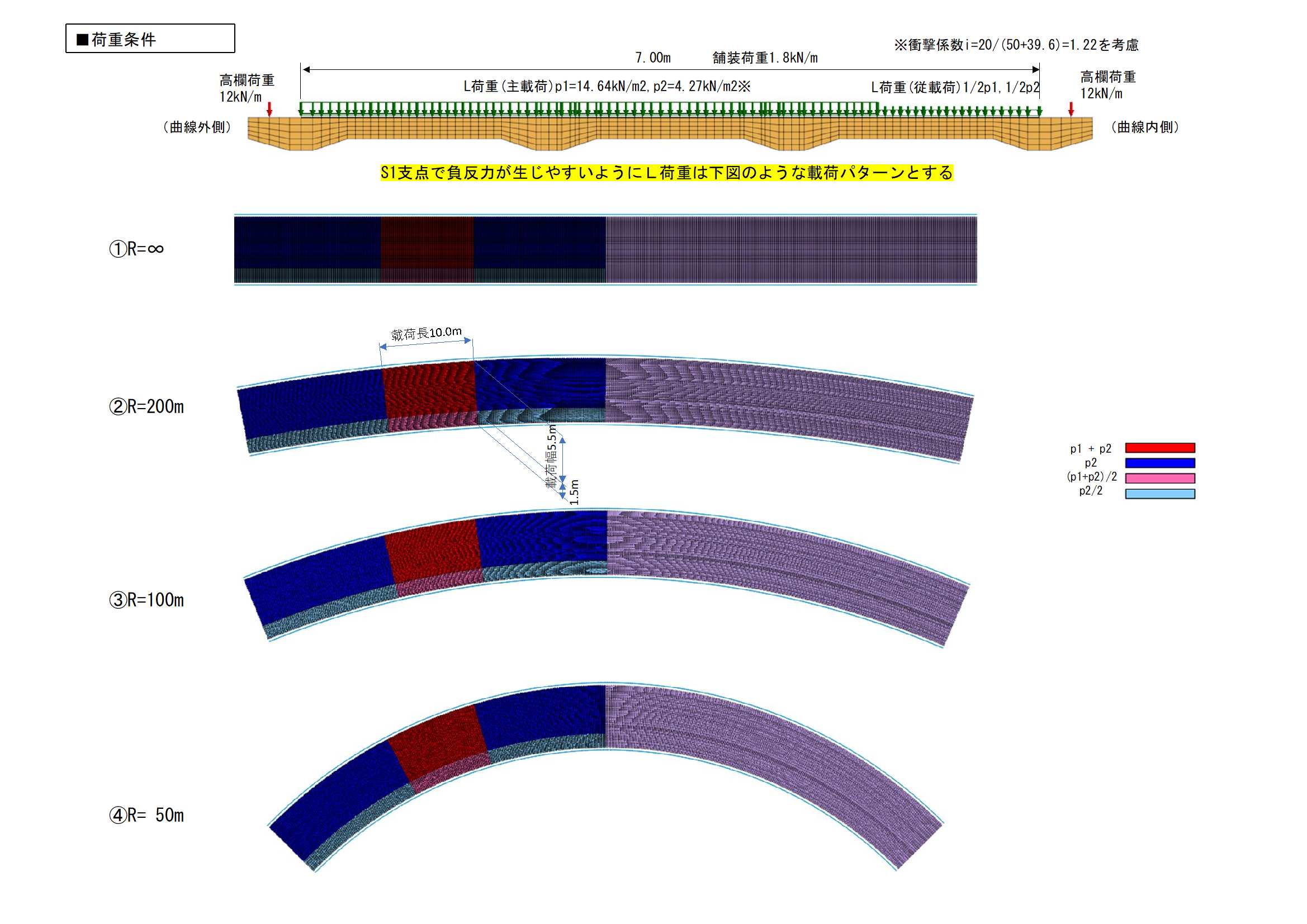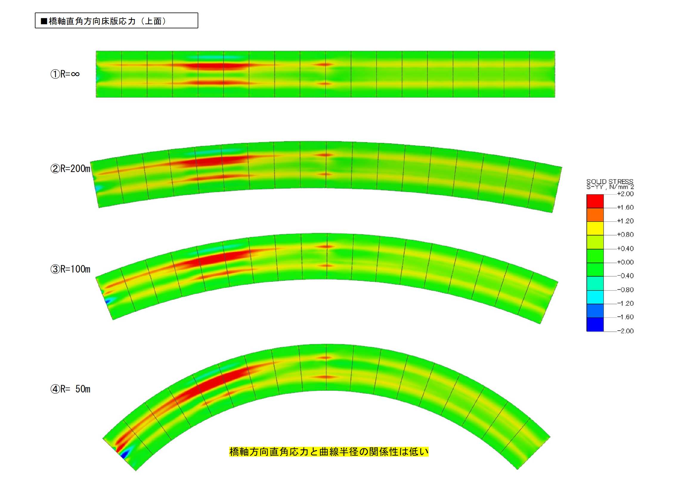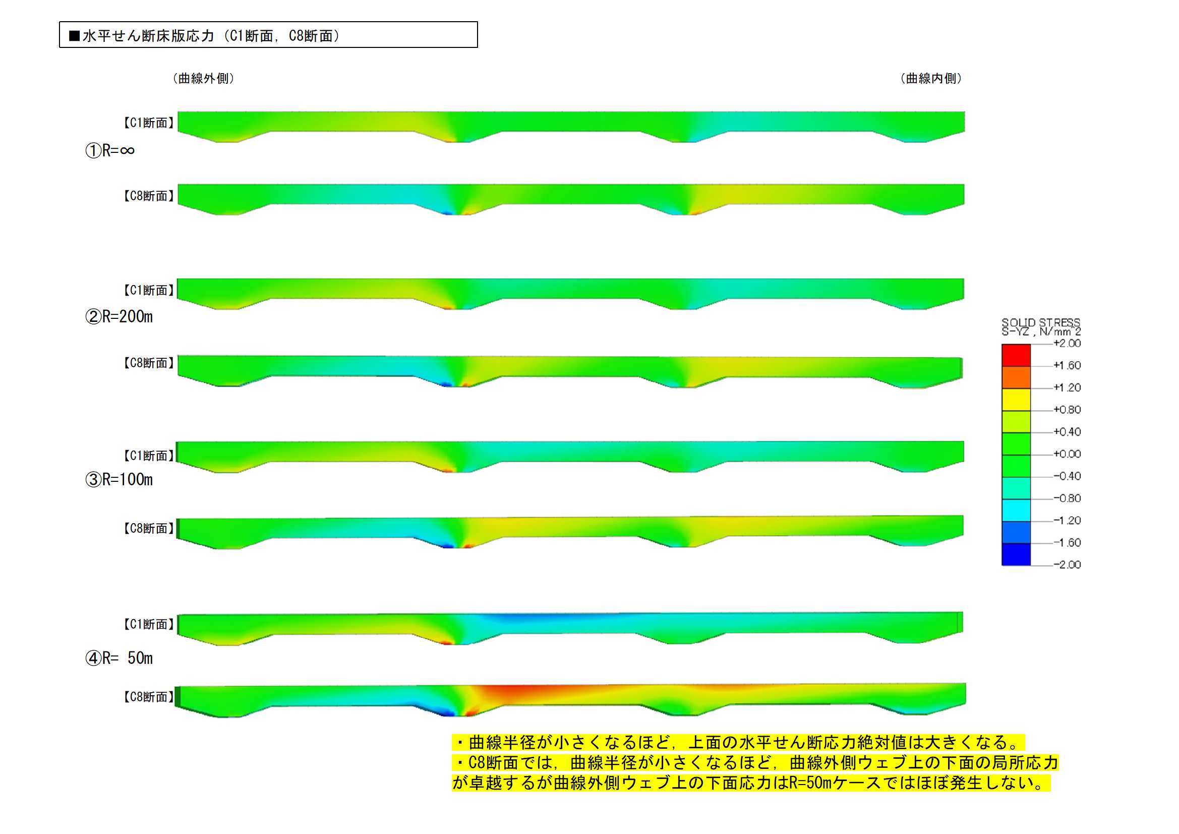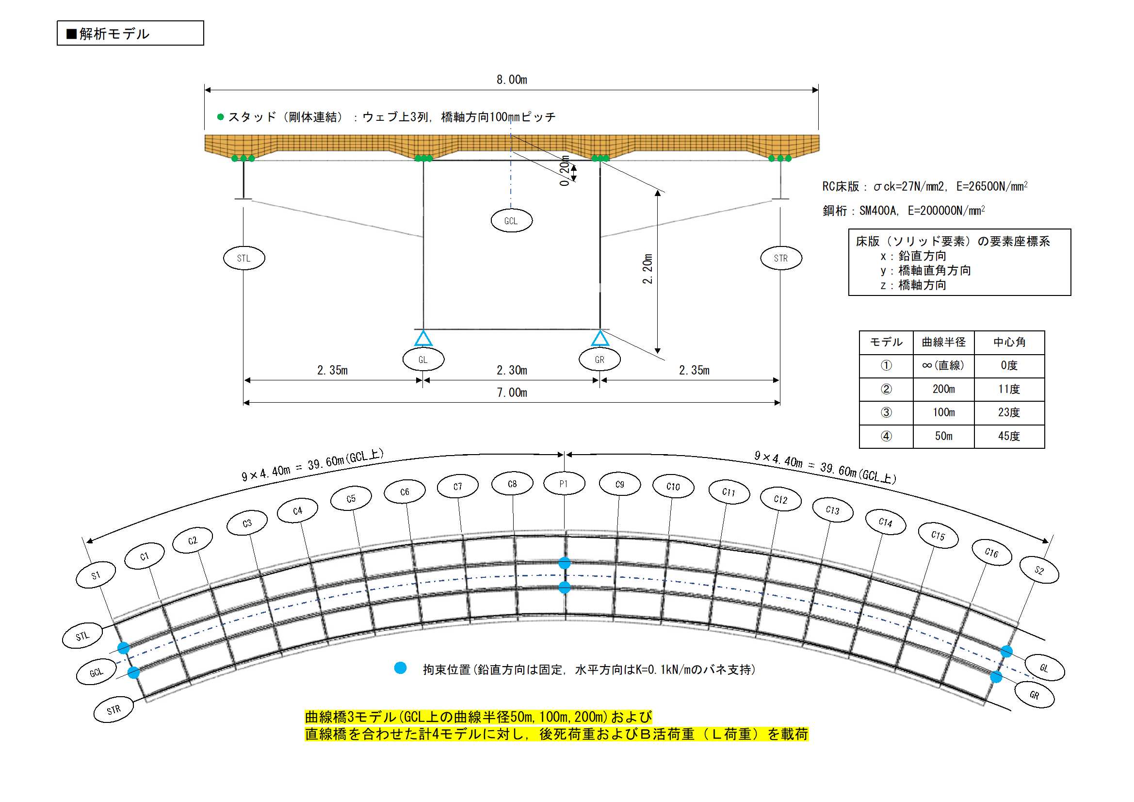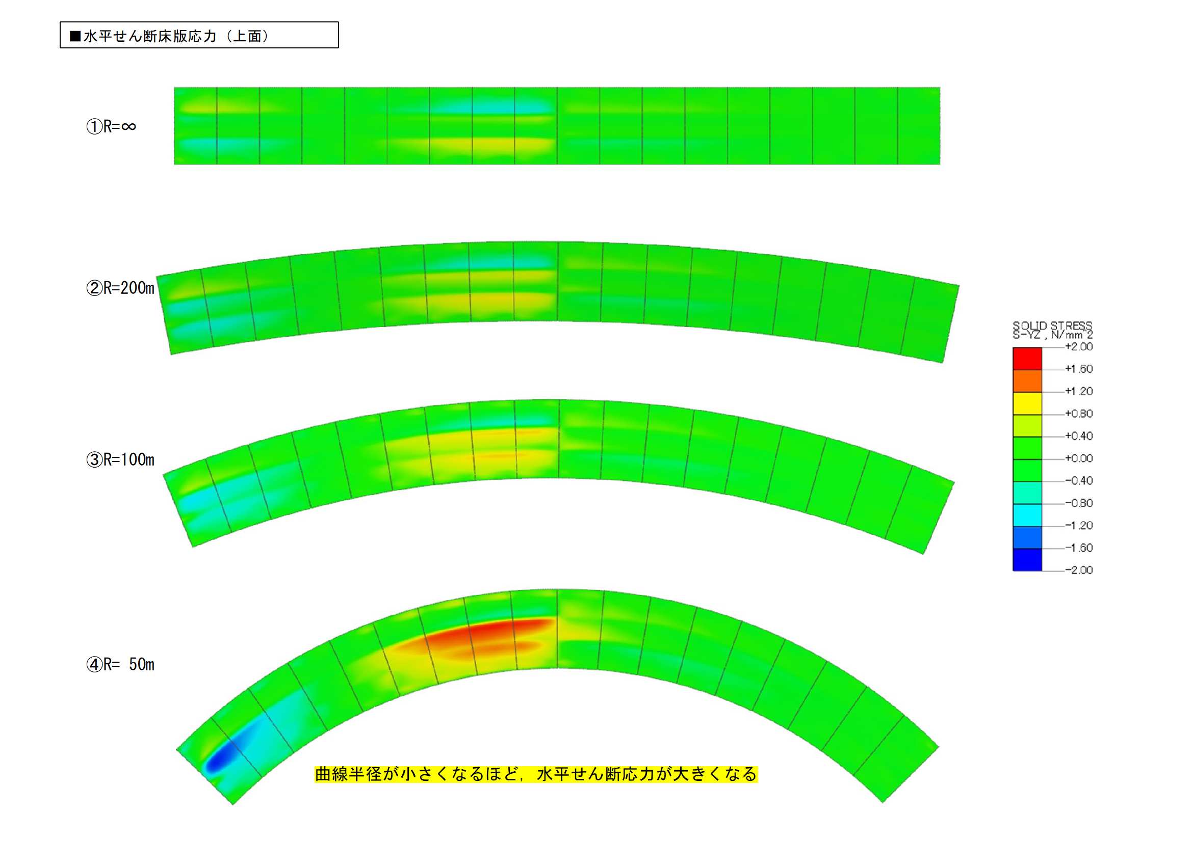 RC床版を有する2径間連続の単一箱桁モデルに対し,直線,R=200m,R=100m,ならびにR=50mの4ケースの解析を実施し,得られた知見を以下に示します。