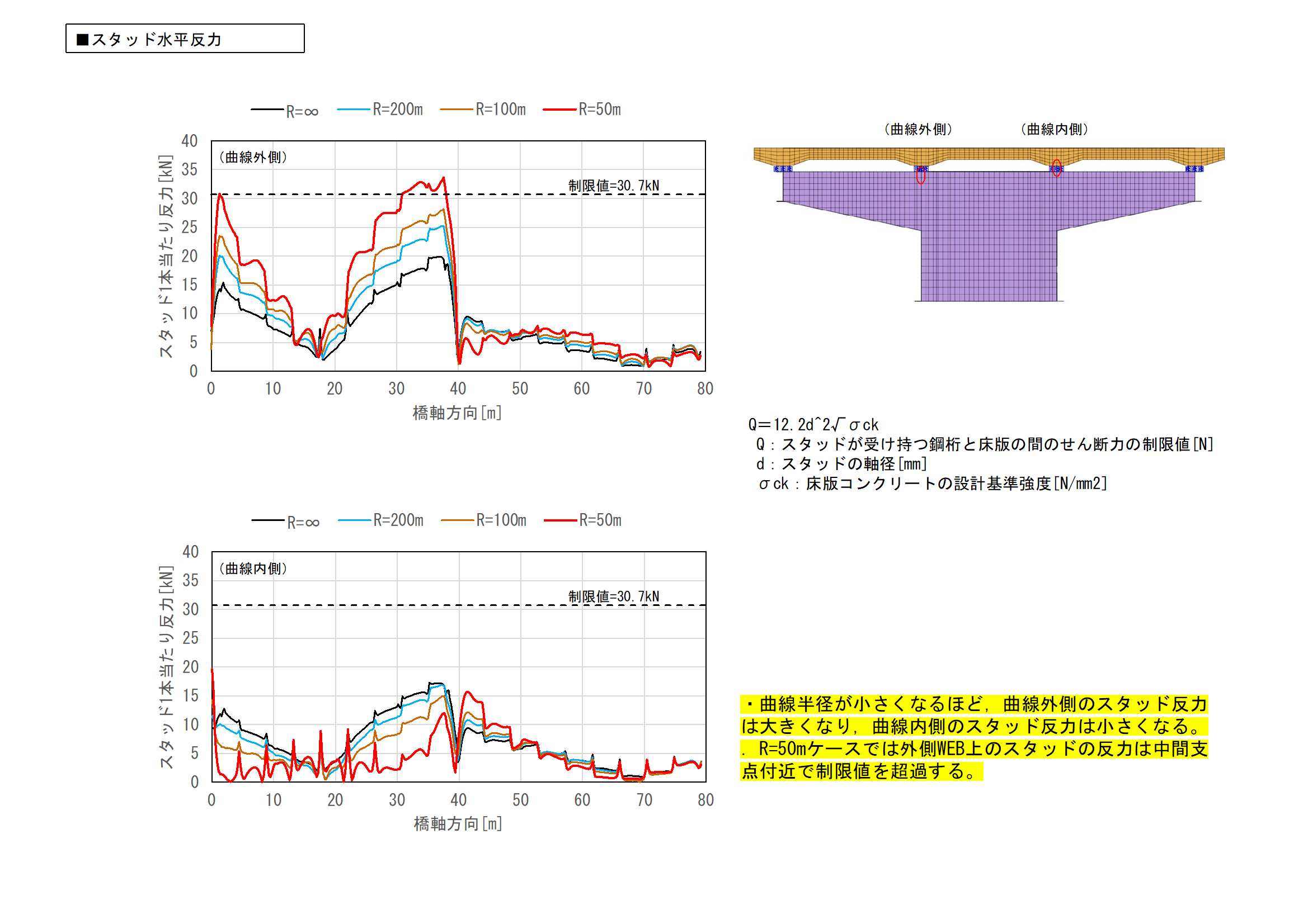 3)スタッド反力は,R=100m(中心角23度)では制限値を超過しないが,R=50m(中心角45度)では,中間支点で制限値を超過する。