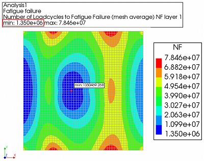 続いてDIANAで疲労破壊解析(Fatigue Failure Analysis)を実行すると,図-8に示す疲労寿命コンターから,各位置における疲労寿命分布が容易に把握できる.さらに,着目した節点における解析結果がNp=1350469.265(cycles)となり,これを手計算によって求めた結果N=1350048.865(cycles)に比較すると,誤差率は僅か0.031%であって,疲労破壊解析を実施した結果,手計算により算出された疲労寿命の理論値とほぼ一致する結果が得られた.