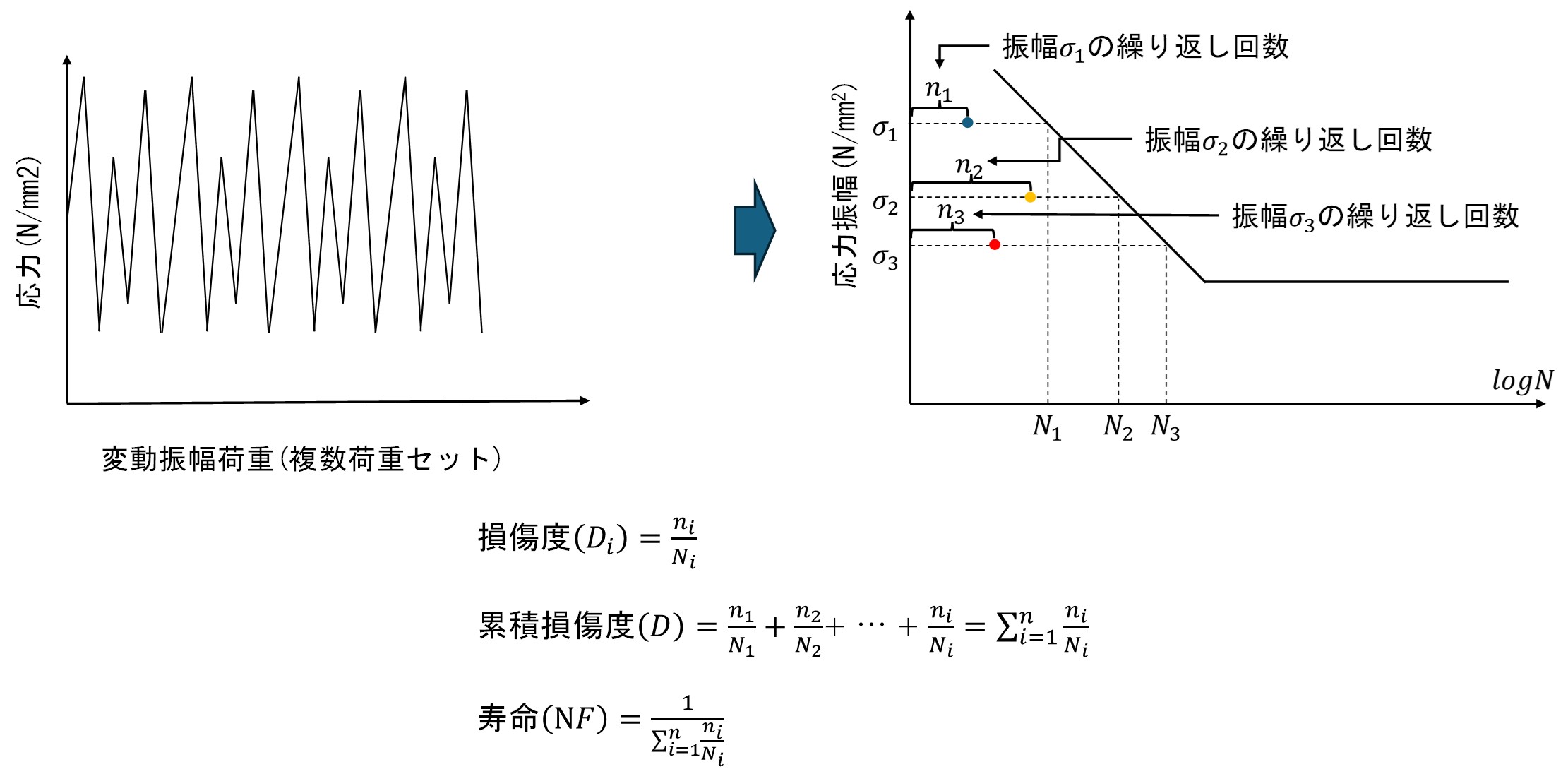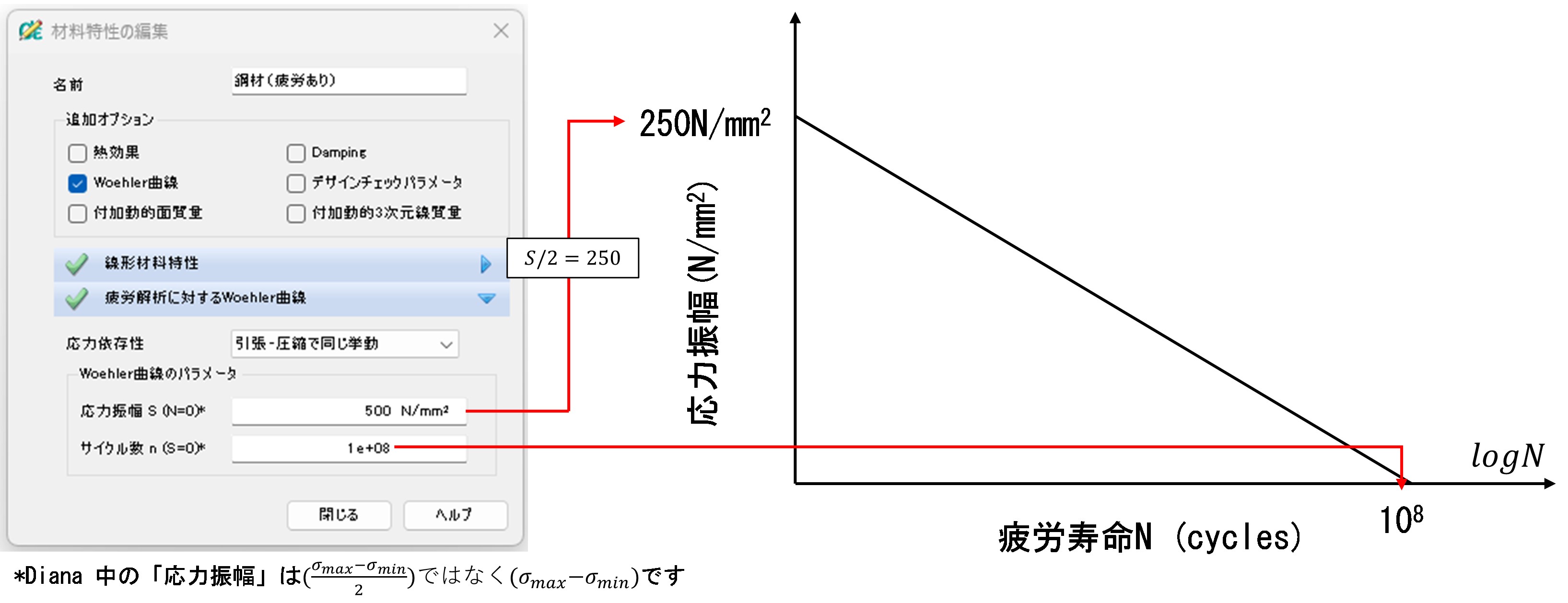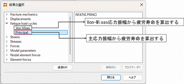を取得する.これに基づき,定義されたS-N曲線により,該当節点位置における疲労寿命(現在の荷重条件下で何回の載荷により破壊に至るか)を,以下の式を用いて算出する.