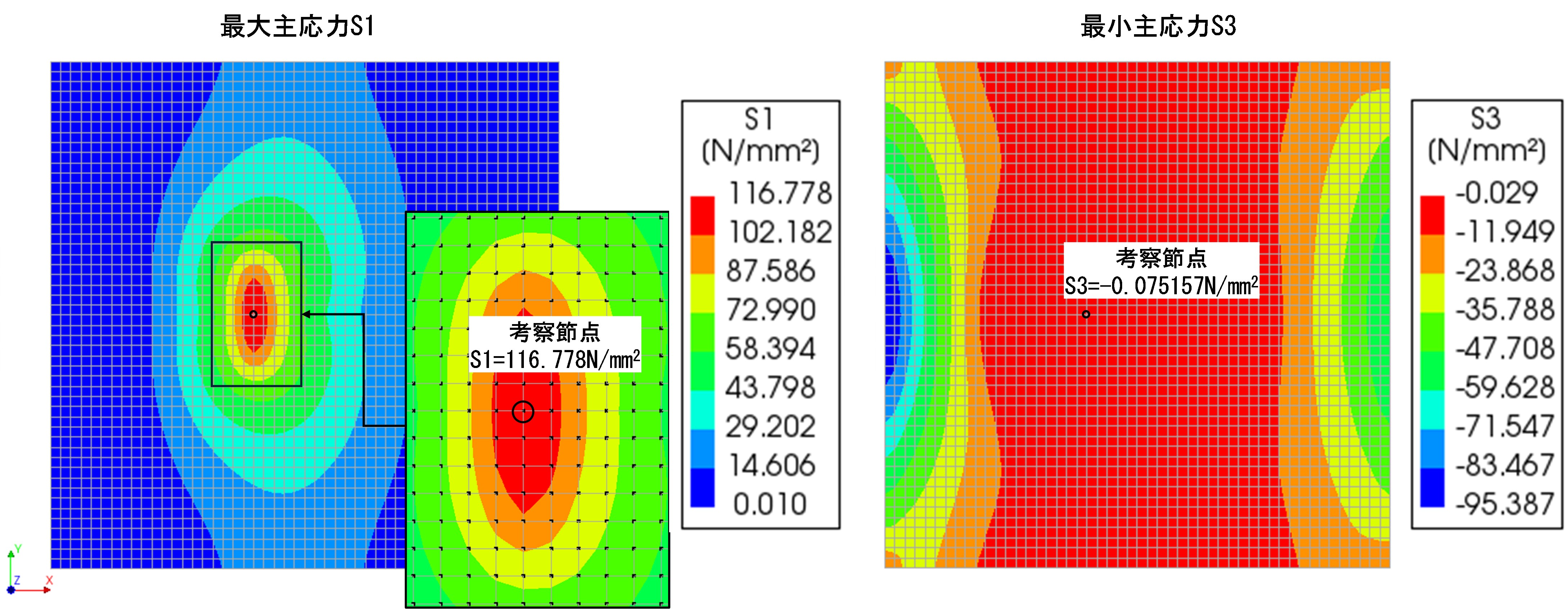 構造モデルが単純で,かつ荷重セットも1ケースのみであるため,図-7に示すように,DIANAによる静的構造解析を通して各要素/節点の最大・最小主応力が容易に確認できる.ここでは,最大主応力および最小主応力を基準として,手計算により理論寿命値を算出する.